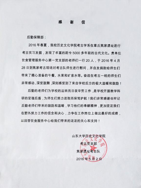 近日,历史文化学院考古党支部焦家遗址考古队给后勤保障部送来感谢信,对日前饮食管理服务中心第一党支部看望慰问奋战在考古一线的师生们表示感谢。