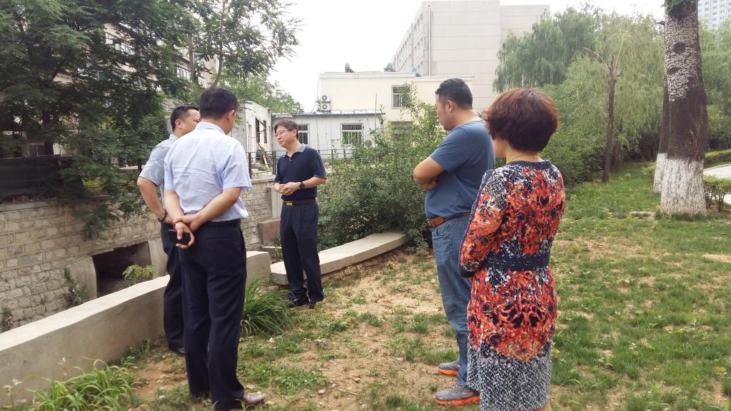 后勤保障部与洪家楼街道办事处领导到校内泄洪沟下游现场勘查河道清淤情况。