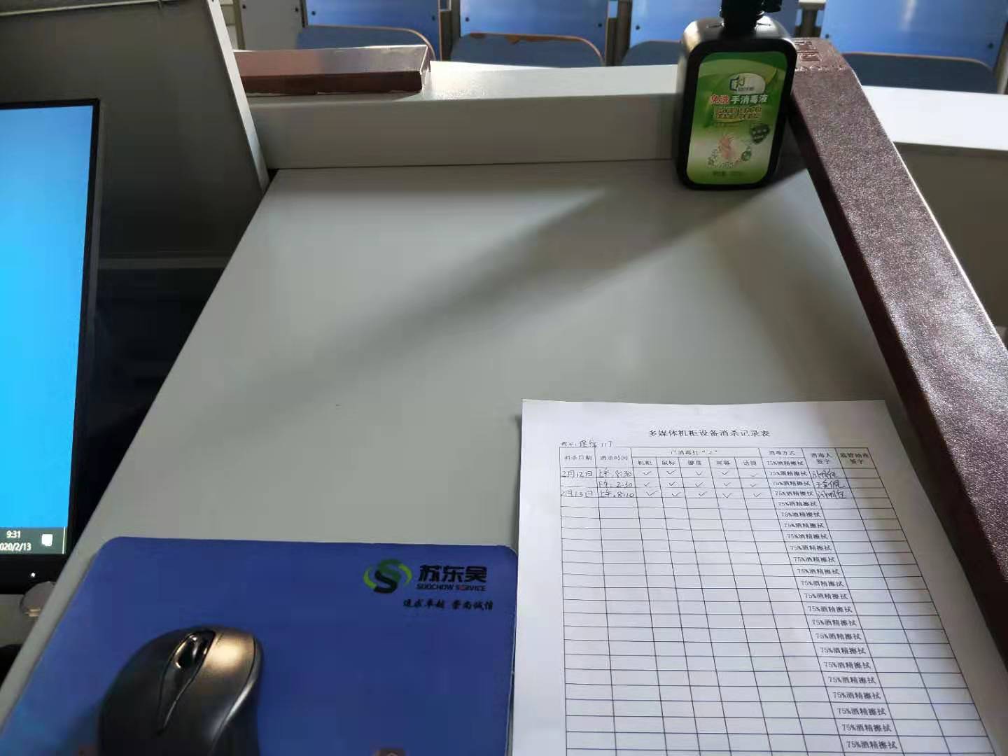 精准把握。为保障授课的正常进行,坚持三个绝对:一是绝对保障多媒体设备和摄影设备正常运行。二是绝对保障灯光到位。三是绝对保障板书工具配备到位。为保障授课教师的健康,坚持四个必须:一是必须保障教师上课期间通风良好。二是必须保障讲桌、控制台等密切接触区域单独张贴消杀记录。三是必须保证板书工具以及键盘、鼠标等细节之处的全面消毒。四是必须在讲桌摆放一瓶免洗洗手液,保障教师需要。通过科学合理的一系列措施,坚决把疫情扩散势头遏制住。