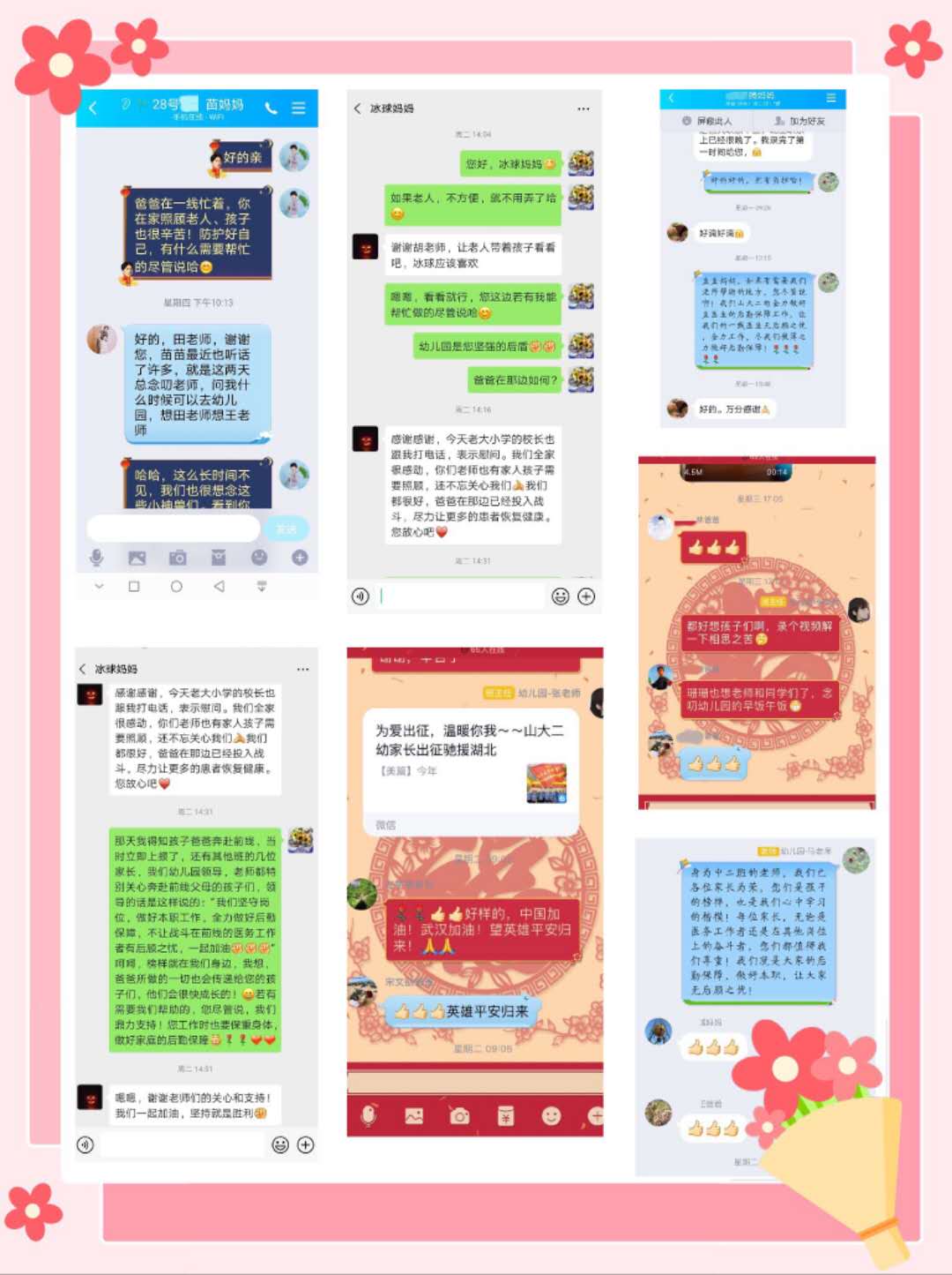 新冠肺炎的战“疫”打响以来,无数医护人员舍小家、为大家,奔赴抗击疫情前线,这其中就有我们的家长朋友,山大幼教中心主任张卫东牵头对各幼儿园共一线医护人员家长及幼教职工家属进行慰问,采取电话沟通、视频连线、网络交流等多种形式,与孩子和居家陪护的家长进行沟通交流,把对孩子的关爱送达到位,让一线医护人员放心、安心。