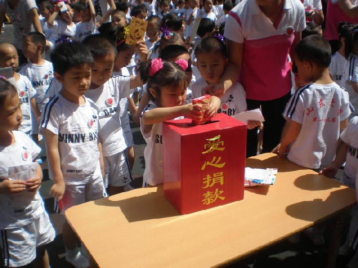 今年一幼小朋友的“六一”儿童节,过得非同寻常:伴随着歌曲《爱的奉献》,一双双富有爱心的小手把平日积攒的一分,一角零花钱投进“向灾区小朋友献爱心”的募捐箱里,短短时间便募集13634.54元。