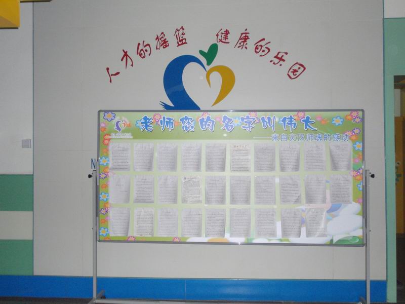 汶川地震后,灾区校园里发生的一个个壮怀激烈的故事,不断撞击着我们的胸膛,让我们无不动容,泪流满面。那些英雄的教师们,用鲜红的血液谱写了人生最优美的篇章,是他们让我们再一次读懂了“师德”二字的博大与崇高。在“六一”节来临之际,为了缅怀那些逝去的英雄,二幼教师结合自己的工作实际,有感而发,制成展板交流感想。教师们纷纷表示,英雄教师的血不会白流,我们会继续勇敢而坚强地走下去,继续着他们的爱,继续着他们美好的希望!(王妍 第二幼儿园)
