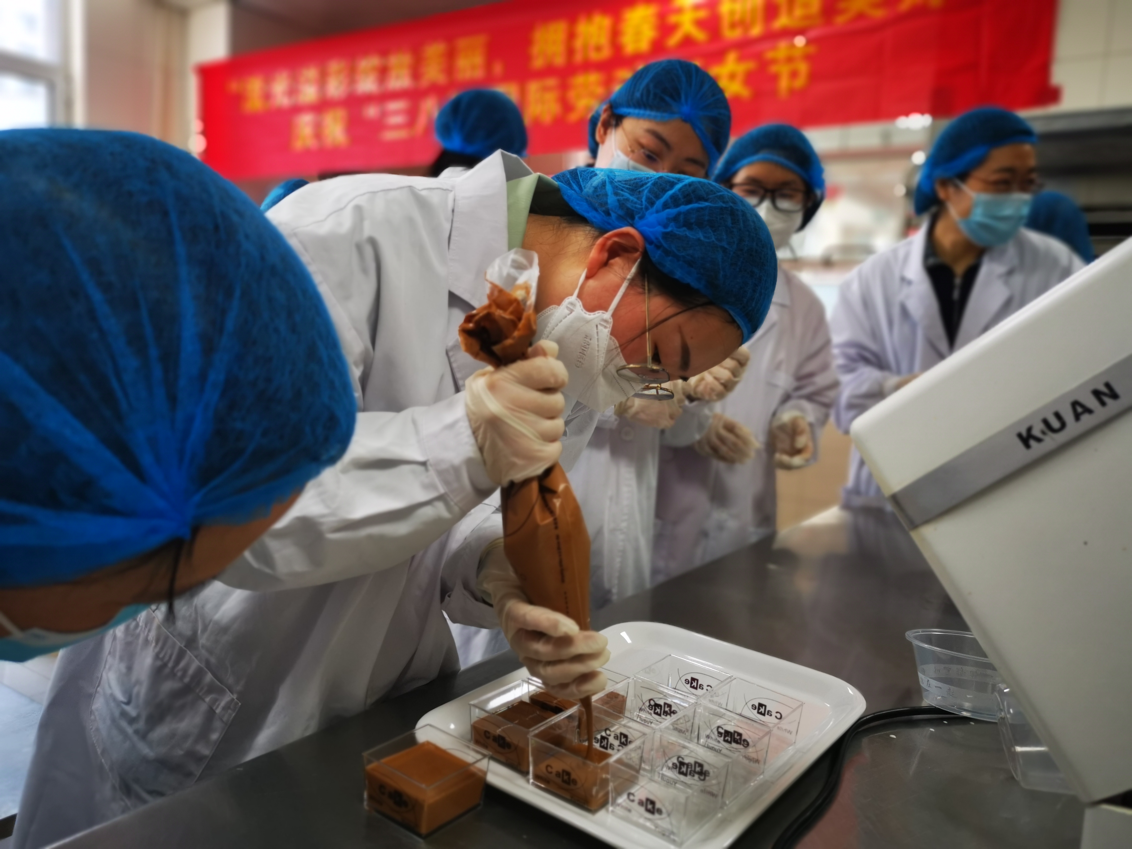 两校区食堂分别选派骨干厨师作为老师,教授了提拉米苏、蔓越莓饼干、杨枝甘露、卡布奇诺慕斯、小熊泡芙等甜品的制作方法。女教职工们专心致志,互相交流、齐心协作,乐在其中,一个个软糯绵密的甜品在她们的巧手下完美呈现。