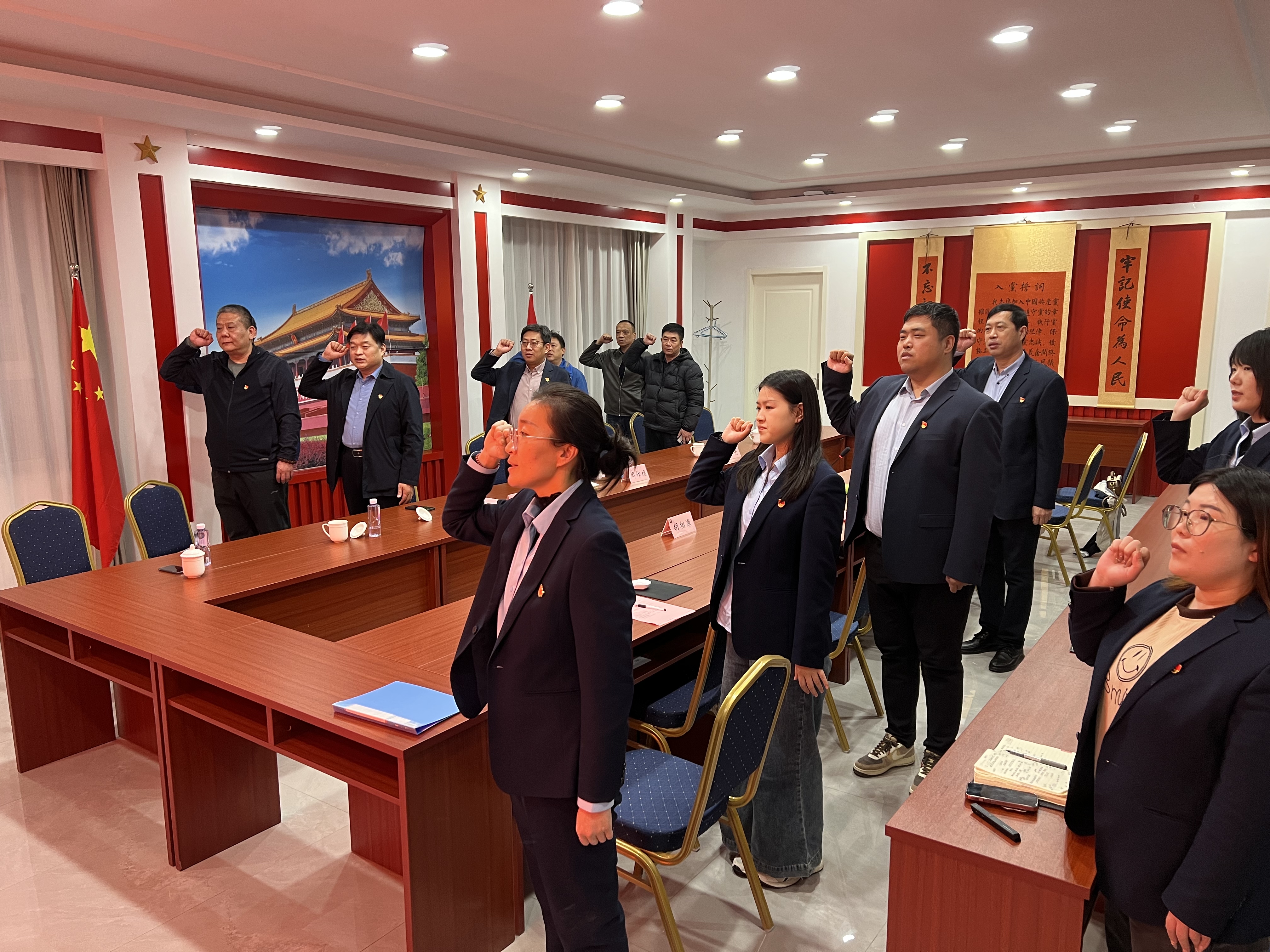 活动最后,全体党员举起右拳,重温入党誓词,并齐唱《没有共产党就没有新中国》。庄重神圣的誓词,嘹亮的歌声,强烈感染着每一位党员,铿锵有力的宣誓声,体现了党员对中国共产党的无限忠诚与热爱。党员们一致表示,要以此次活动为契机,进一步加强支部间的互联互通、互助互动,强化创新举措,开展形式多样的校企共建活动,助力后勤服务保障水平持续提升。